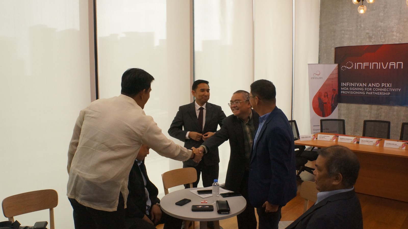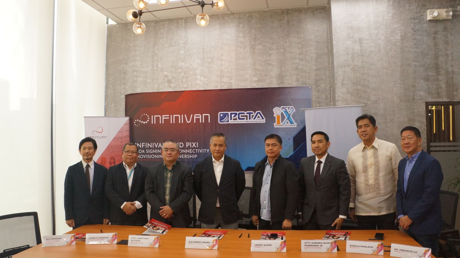 The contract signing was attended by PCTA Internet Exchange Executives, President Cedric Sazon, Chairman of the Board Atty. Goering George Paderanga Jr., Director Ronaldo Manlapig, and Director Dr. Venancio Lo, along with InfiniVAN Executives' Senior Vice President for Special Projects Koji Ishizaka, Chief technology Officer Alberto Espedido, Chief Legal Counsel Atty. Jonathan Altubar, Adviser Alejandro Aquino.